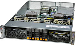Two hot-pluggable systems (nodes) in a 2U form factor. 2 PCI-E 4.0 x16 (LP) slots. Liquid cooling support. Redundant power supply.