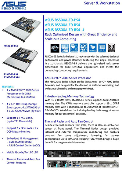 High power-efficiency with redundant power option, designed for flexible storage with 4x SAS or SATA drives. Complete IT infrastructure management with ASMB9 out-of-band remote management and in-band ASUS Control Center