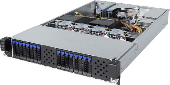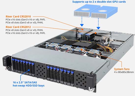 Supports up to 2x double slot GPU cards, 16x 2.5" hot-swappable HDD/SSD bays, 2x SFP+ 10Gb/s LAN ports (Broadcom® BCM 57810S)