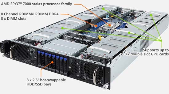 Supports up to 8x double slot GPU cards, redundant power option, 2x SFP+ 10Gb/s LAN ports (Mellanox® ConnectX-4), Aspeed® AST2500 remote management controller