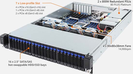 16x 2.5" hot-swappable HDD/SSD bays, 2x SFP+ 10Gb/s LAN ports (Broadcom® BCM 57810S), 7x low profile PCIe Gen3 expansion slots, redundant power option