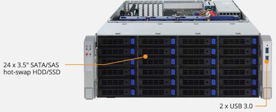 36 x 3.5" SATA/SAS hot-swap HDD/ SSD bays, 2 x 2.5" SATA hot-swap SSD for booting device, SAS expander with 12Gb/s transfer speed, redundant power option