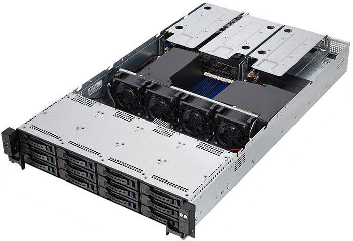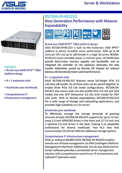 AMD EPYC™ 7002 2U compact server with support up to dual processors, 32 DIMM, 12 SATA/SAS, 2 M.2, dual LAN, OCP 2.0 Mezzanine card and ASUS Control Center.