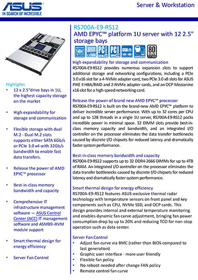 12x 2.5" drive bays in 1U, the highest capacity storage on the market. High expandability for storage and communication. Comprehensive IT Infrastructure Management Software.