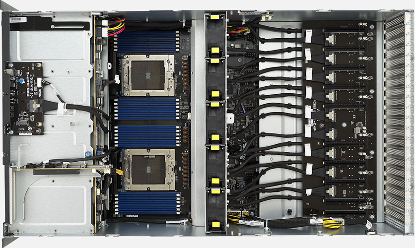Dual AMD EPYC 9004 Series Processors, Supports up to 8x double slot GPU cards, Quad 2600W redundant power supply, 8x 3.5"/2.5" NVMe/SATA/SAS hot-swappable drive bays.