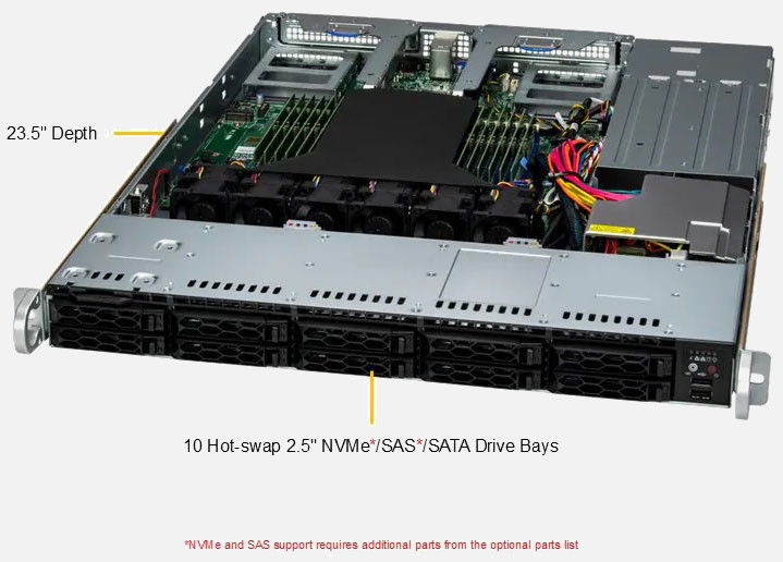 Single AMD EPYC 9454P Processor, 384GB RAM, 2x 960GB M.2 NVMe, Supports up to 2x FHHL PCIe Gen5 x16 slots, 10x 2.5" SATA/NVMe Hybrid hot-swap drive bays.