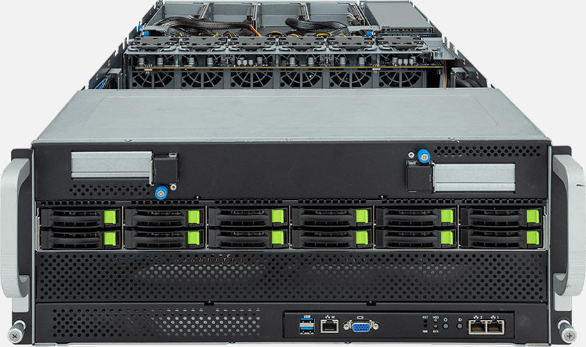 Dual AMD EPYC 9004 series processors, Supports up to 8x double slot GPU cards, 2x 1Gb/s BASE-T LAN ports (Intel® I350-AM2) , 12x 2.5" NVMe/SATA/SAS hot-swappable drive bays.