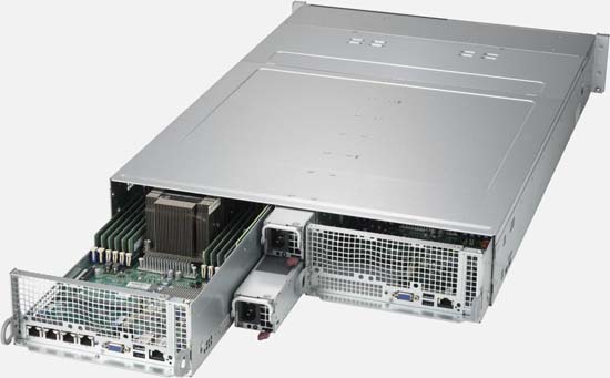 This 2U Twin delivers an innovative architecture where devices can be hot-swapped to allow for easier maintenance, to reduce/eliminate down time and to save space and energy.
