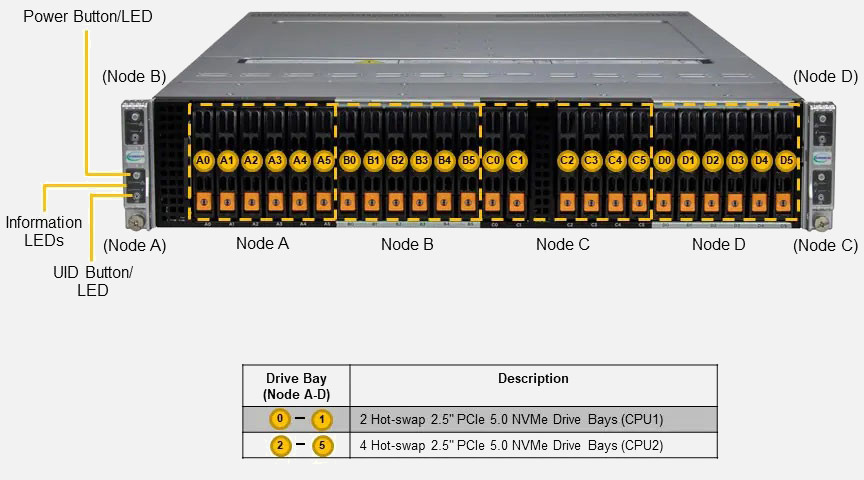 Ideal for Hyperconverged Infrastructure, Diskless HPC Cluster, High-Performance File System and Diskless HPC Clusters. Quad Node 2U Form Factor. Redundant 3000W Power Supply, 6x 2.5" hot-swap NVMe/SATA drive bays (Per Node)