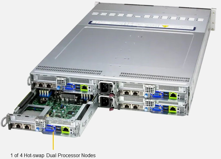 Quad node, Dual Intel Xeon 6 6700 series Processor per node. Ideal for All-Flash Hyperconverged Infrastructure & Diskless HPC Clusters. 2x PCIe 5.0 x8 LP slot. 3600W Redundant Power Supply, 6x 2.5" NVMe/SAS Hot swap drive bays per node.