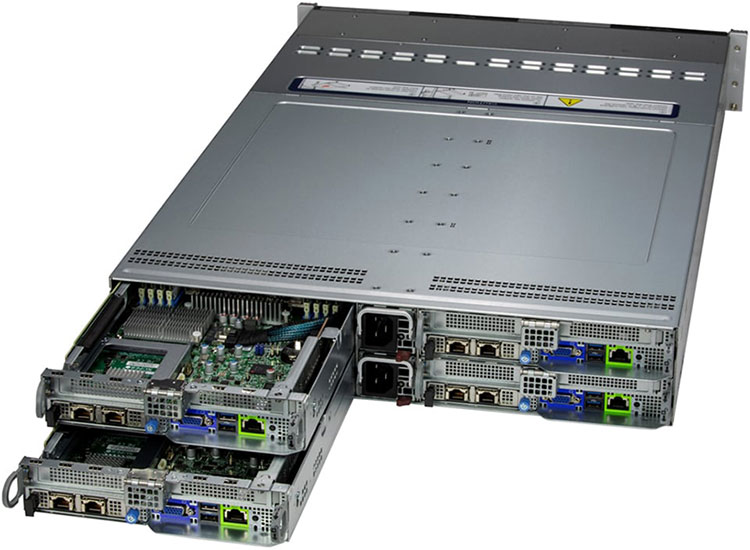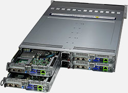 The Supermicro BigTwin SuperServer 222BT-HNC8R | SYS-222BT-HNC8R can be configured with 2.5" drives, a more space efficient and low noise option. These drives also offer energy savings and increased flexibility.