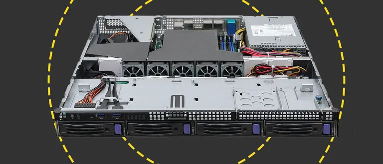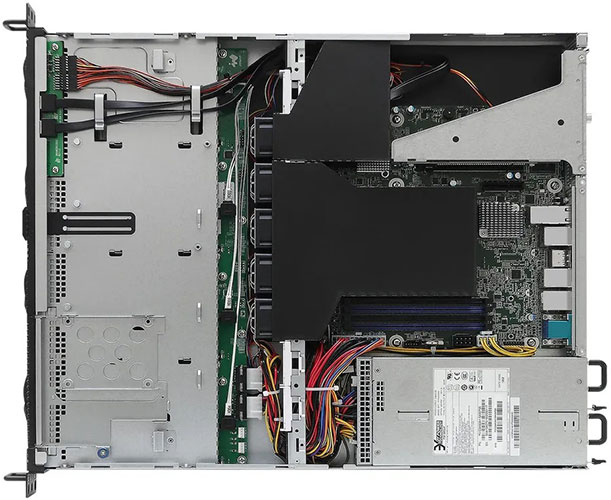 Network connections are plentiful as the rear panel presents pairs of embedded Gigabit and 10GbE RJ-45 ports plus a dedicated Gigabit port for the server's IPMI controller. There's room to expand further as the motherboard's riser card provides a single full-height PCIe Gen4 slot.