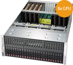 8x PCI-E 3.0 x16 slots (support up to 8x double width GPU), 2x PCI-E 3.0 x8, 1x PCI-E 2.0 x4, Up to 24 Hot-swap 2.5" drive bays; 8x 2.5" drives supported natively, 2x 10GBase-T LAN ports via Intel C622