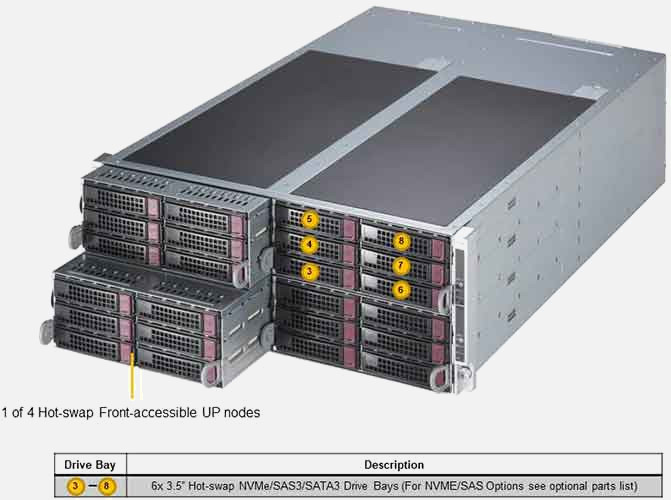 Ideal for HPC and Big Data, Hyperscale, Hyperconverged and Data Centre Enterprise Applications. Quad Node 4U Form Factor. Redundant 2000W Power Supply, 8x 3.5"/2.5" hot-swap NVMe/SATA/SAS drive bays (Per Node)