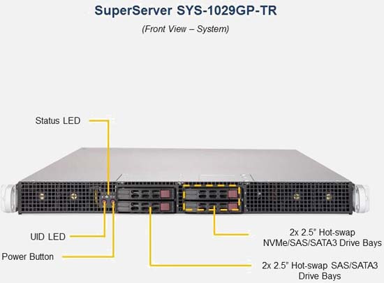 The Supermicro SuperServer 1029GP-TR | SYS-1029GP-TR can be configured with 2.5" drives, a more space efficient and low noise option. These drives also offer energy savings and increased flexibility.