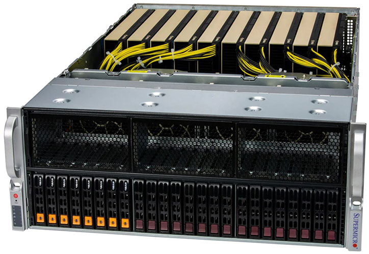 Ideal for HPC, AI, Deep Learning, cloud gaming, VDI, rendering and animation. 13x PCI-E 5.0 x16 slots. Redundant 2700W Titanium Power Supply, 24x 2.5" hot-swap NVMe/SATA drive bays