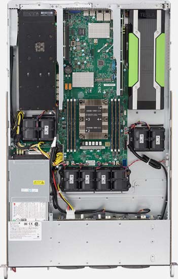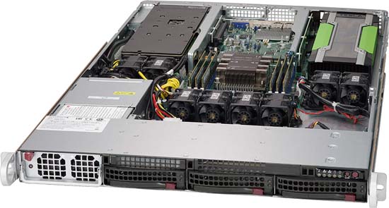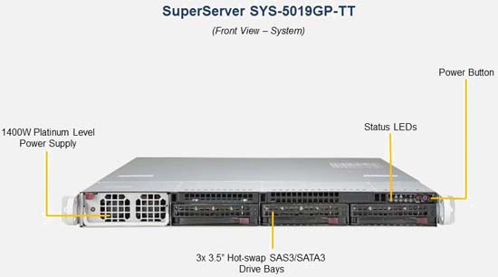This system can be configured with up to 3x hot-swap 3.5 SAS/SATA hot-swap drives. It is also equipped with 3x PCI-E x16 expansion slots and 1400W high-efficiency power supply. For networking it features 2x 10GBase-T LAN ports via Intel X550.
