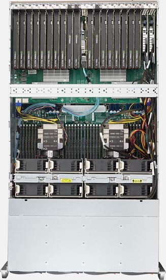 20x PCI-E 3.0 x16 supporting up to 20x Single Width GPU; 1x PCI-E 3.0 x8 (FH, FL in x16 slot), 24x Hot-swap 3.5" drive bays (2x Optional U.2 NVMe 2.5" drives), 2x 10GBase-T LAN ports via Intel C622