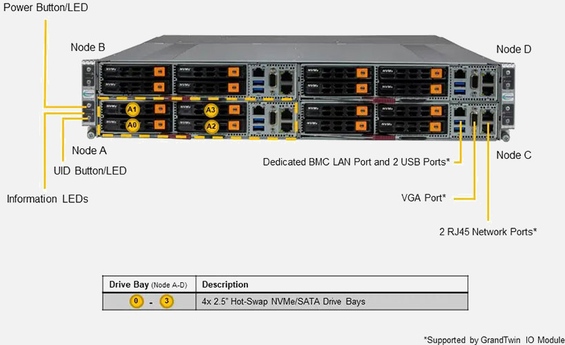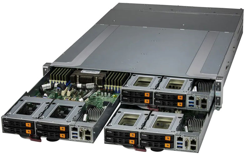 Ideal for HPC, MEC, Cloud Gaming, Multi-purpose CDN, High-availability Cache Cluster and EDA. Quad Node 2U Form Factor. Redundant 2200W Power Supply, 4x 2.5" hot-swap NVMe/SATA drive bays (Per Node)