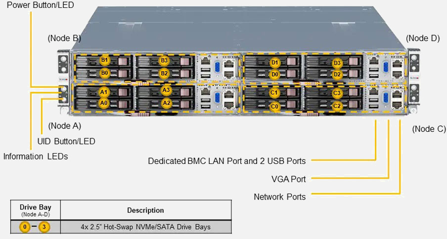 Ideal for HPC, MEC, Cloud Gaming, Multi-purpose CDN, High-availability Cache Cluster and EDA. Quad Node 2U Form Factor. Redundant 2200W Power Supply, Up to 4x 2.5" hot-swap NVMe/SATA drive bays (Per Node).