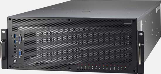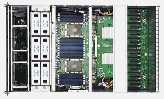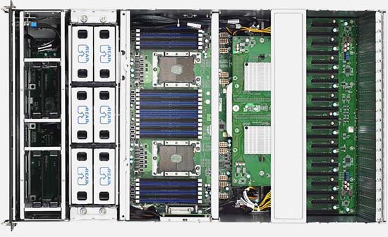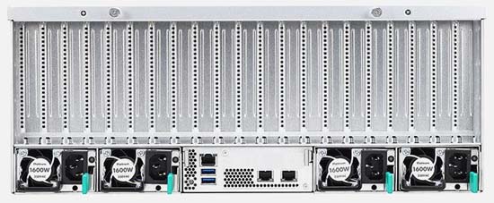 This system can be configured with up to 4x 3.5 or 2.5 SATA drives and has a maximum RAM capacity of a huge 3TB. It also features 10x double-width PCIe x16 slots for GPUs, 1x PCIe x16 slot for NIC up to 100Gb/s and a redundant power supply.