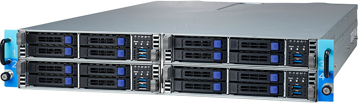 2U4N 1S 8-DIMM NVMe/SATA HCI Server. 4 1S EPYC (Rome) sleds, front-serviced. 2 HH/HL PCIe Gen.4x16 slots per sled. (1+1) RPSU.