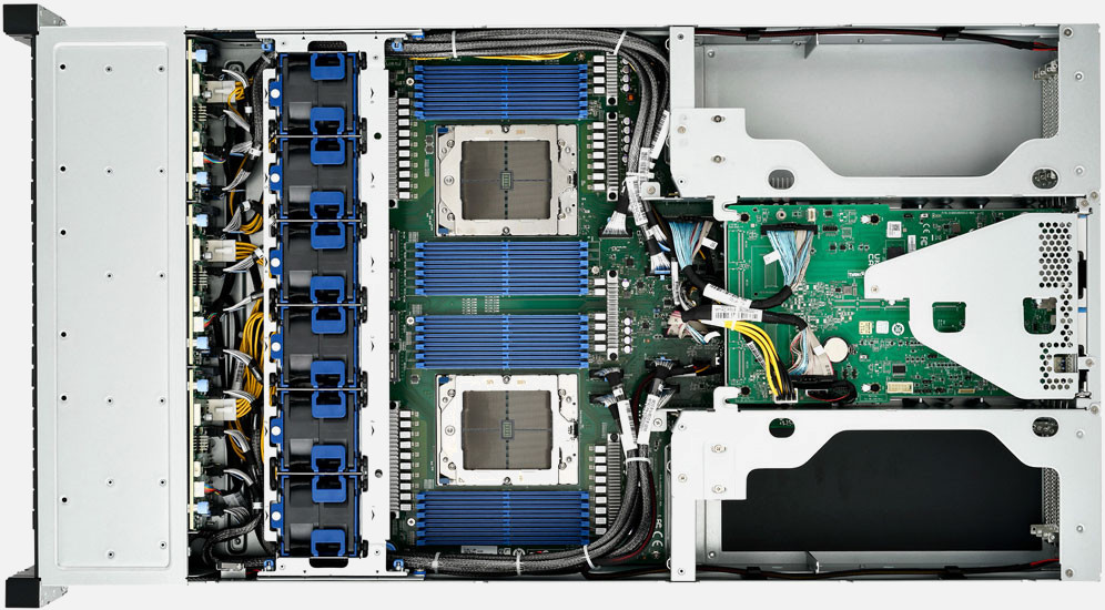 2U2S 4GPU AI Server, Dual AMD EPYC 9004 Series Processors, Supports 4x Dual slot GPU Cards, 2700W Redundant power supply, 24x NVMe hot swap drive bays,