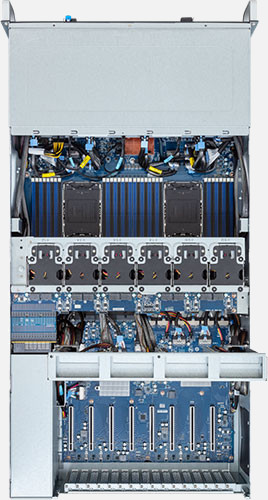 Dual 4th Gen Intel Xeon Scalable Processors, Supports up to 8x double slot GPU cards and 10x PCIe Gen5 x16 (LP) Slots, 2x 10Gb/s BASE-T LAN ports (Intel® X710-AT2), 12x 3.5"/2.5" SATA/SAS/NVMe hot-swappable drive bays.