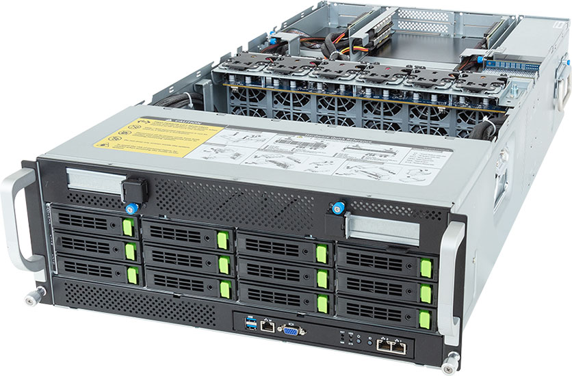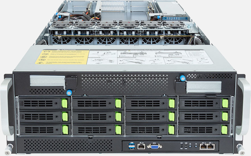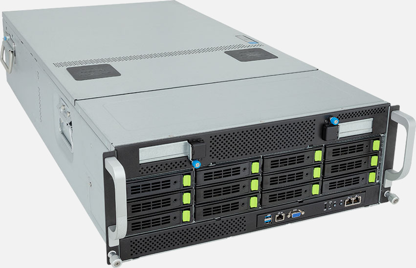 Dual 4th/5th Gen Intel Xeon Scalable Processors, Optimized for 8x NVIDIA OVX™ L40S GPU card slots, 2x 10Gb/s BASE-T LAN ports (Intel® X710-AT2), 12x 3.5"/2.5" SATA/SAS/NVMe hot-swappable drive bays.