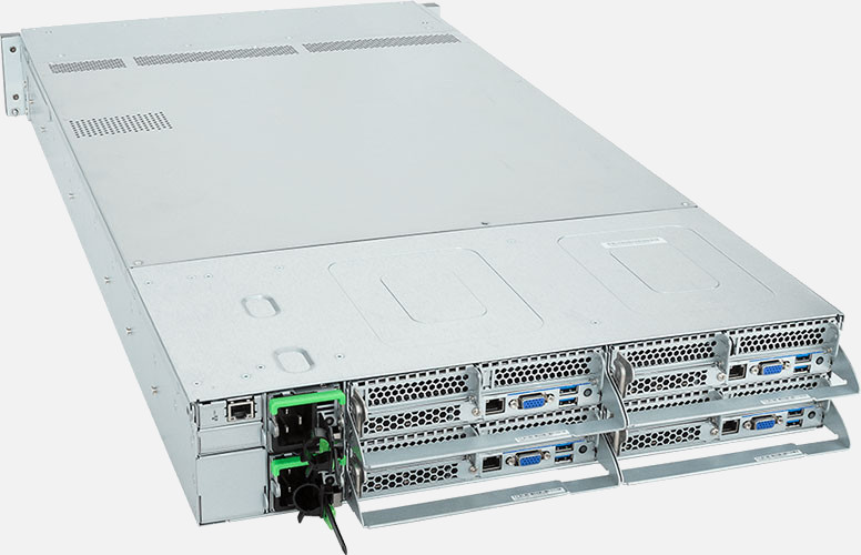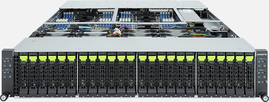 Quad Node, Dual 4th Gen Intel Xeon Scalable Processors (Per Node), 8x LP PCIe Gen5 x16 slots, 2600W Redundant Power Suppply, 24x 2.5" NVMe/SATA/SAS hot-swappable drive bays.