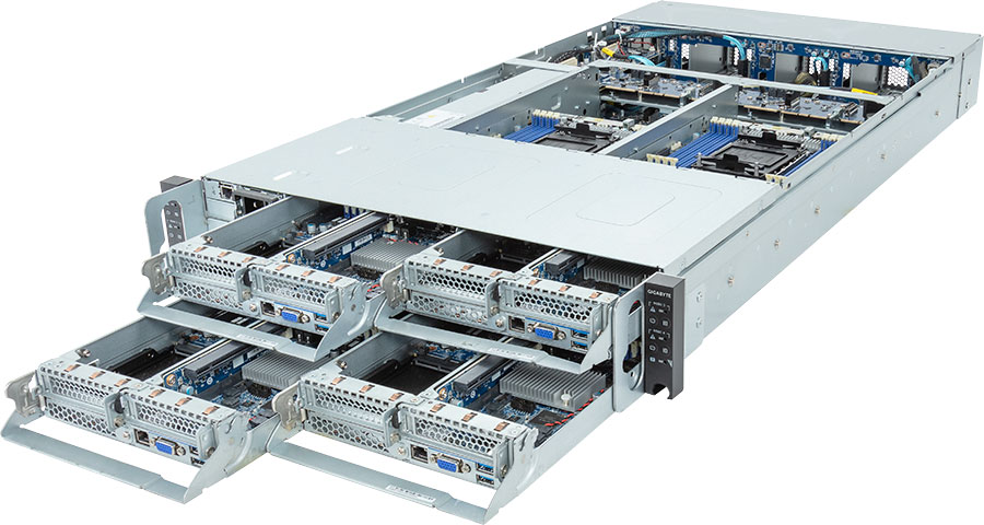 Quad Node, Dual 4th/5th Gen Intel Xeon Scalable Processors (Per Node), 4x LP PCIe Gen5 x16 slots, 3000W Redundant Power Suppply, 8x 2.5" NVMe/SATA/SAS hot-swappable drive bays.