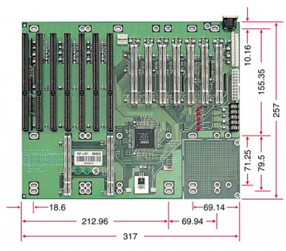 Fit for 14-slot chassis ATX power connector support 9 ISA / 4 PCI usable Back Plane. 317(L) x 257(W) mm;12.48"(L) x 10.12"(W).