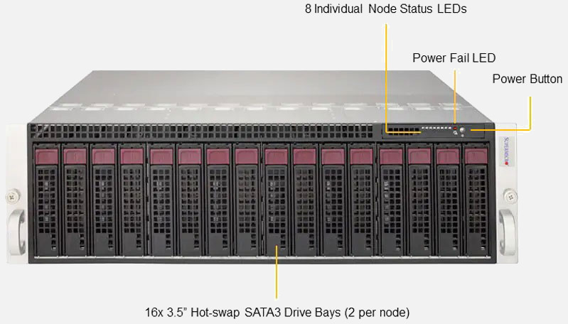 Intel Xeon E-2300 series 8 Node server, Ideal for Cloud Computing, Online Game Server Hosting, Web Hosting, VM and Social Networking. 1x PCI-E 4.0 x8 slot. 2000W Titanium Redundant 1U Power Supply, 2x 3.5/2.5" SATA/SAS/NVMe Hot Swap drives per Node.
