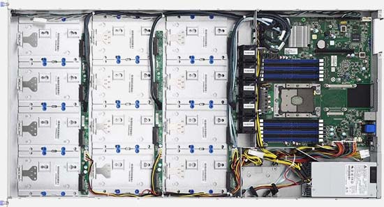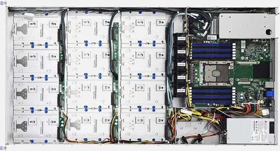 This server supports SATA drives, which are very cost-effective and adept at dealing with mass storage.