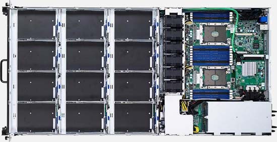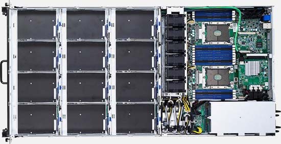1U Storage Server with Service Drawer, powered by dual Intel Xeon SP, has a maximum RAM capacity of 2TB and can be configured with 12x 3.5” SAS/SATA drives and 4x 2.5” NVMe/SATA drives.