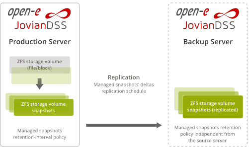 The Open-E JovianDSS On- and Off-site Data Protection retention-interval plan is made up of a sequence of retention periods to interval associations. It's based on ZFS snapshots and ZFS send-receive. There is near zero system load cost of snapshot creation and maintenance. The send-receive function allows for an immediate access to data changes between consecutive snapshots, it can also start replicating data differences each minute.