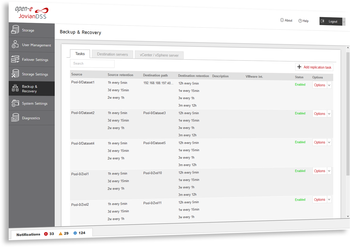 Onsite and Offsite data protection in Open-E JovianDSS delivers an effective strategy for Backup, Archiving and Disaster Recovery through enabling asynchronous replication to local sites or co-locations.