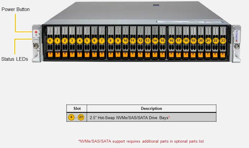 The Supermicro Hyper A+ Server 2125HS-TNR | AS-2125HS-TNR can be configured with 2.5" drives, a more space efficient and low noise option. These drives also offer energy savings and increased flexibility.