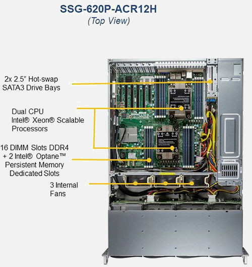 The Supermicro Storage SuperServer SSG-620P-ACR12H | SSG-620P-ACR12H supports the Intel Intel Xeon Scalable Processors 3rd Generation family in a high-density 2U form-factor. These SuperServers are ideal for network infrastructure, front-end enterprise, and minimal-downtime cluster server systems.