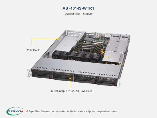 The Supermicro SuperServer 1014S-WTRT | AS -1014S-WTRT supports the AMD AMD EPYC "ROME" Gen 2 , AMD EPYC "Milan" Gen 3 family in a high-density 1U form-factor. These SuperServers are ideal for network infrastructure, front-end enterprise, and minimal-downtime cluster server systems.