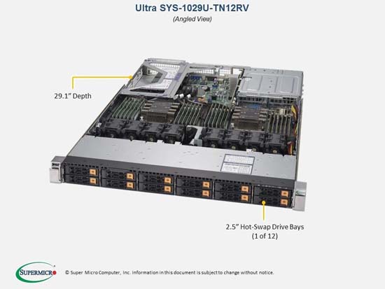 The Supermicro SuperServer 1029U-TN12RV | SYS-1029U-TN12RV can be configured with 2.5" drives, a more space efficient and low noise option. These drives also offer energy savings and increased flexibility.