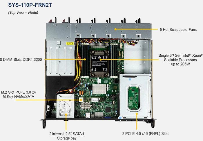 The Supermicro IoT SuperServer SYS-110P-FRN2T | SYS-110P-FRN2T can be configured with 2.5" drives, a more space efficient and low noise option. These drives also offer energy savings and increased flexibility.