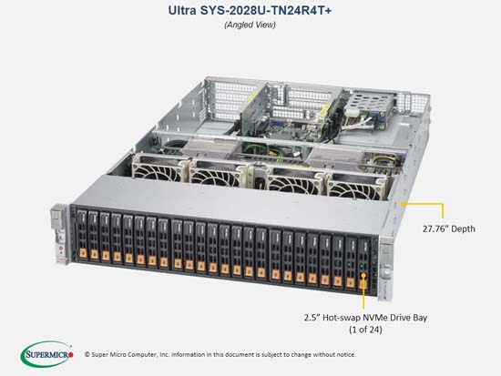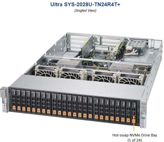 The Supermicro SuperServer 2028U-TN24R4T+ | SYS-2028U-TN24R4T+ can be configured with 2.5" drives, a more space efficient and low noise option. These drives also offer energy savings and increased flexibility.