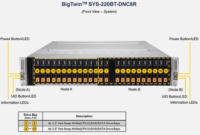 The Supermicro BigTwin SuperServer SYS-220BT-DNC8R | SYS-220BT-DNC8R can be configured with 2.5" drives, a more space efficient and low noise option. These drives also offer energy savings and increased flexibility.