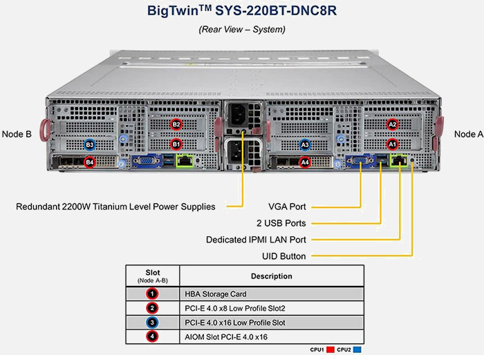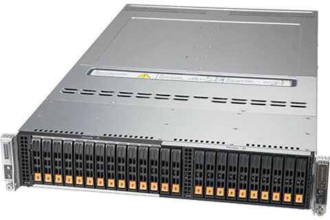 Two hot-pluggable systems (nodes) in a 2U form factor. 2 PCI-E 4.0 x16 (LP) slots. Liquid cooling support. Redundant power supply.