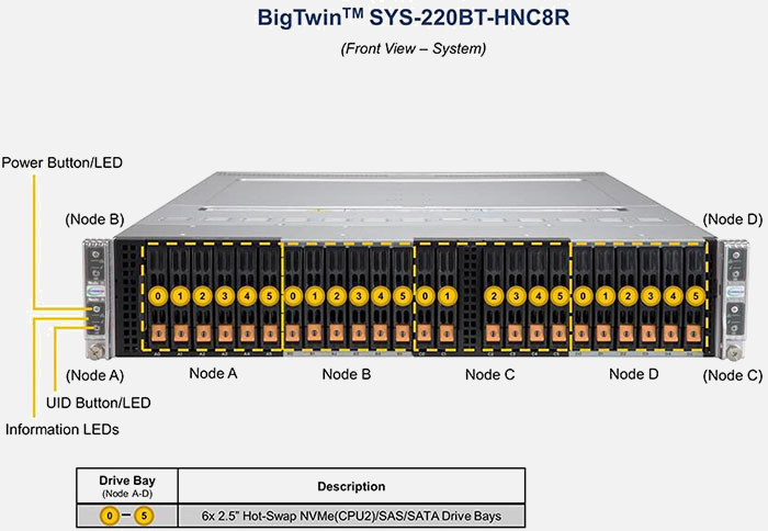 The Supermicro BigTwin SuperServer SYS-220BT-HNC8R | SYS-220BT-HNC8R features hot-swap hard drives, giving you more flexibility and allowing you to remove drives without having to shut down the system.