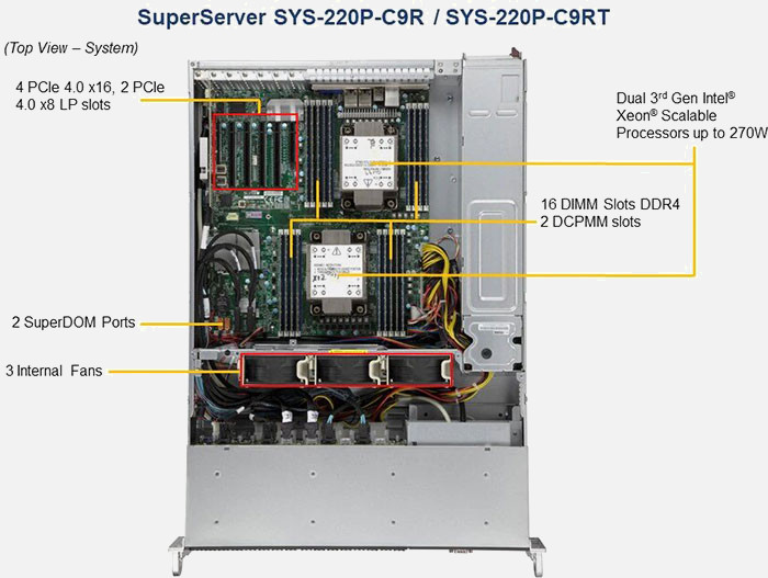 The Supermicro SuperServer SYS-220P-C9RT | SYS-220P-C9RT supports the Intel Intel Xeon Scalable Processors 3rd Generation family in a high-density 2U form-factor. These SuperServers are ideal for network infrastructure, front-end enterprise, and minimal-downtime cluster server systems.