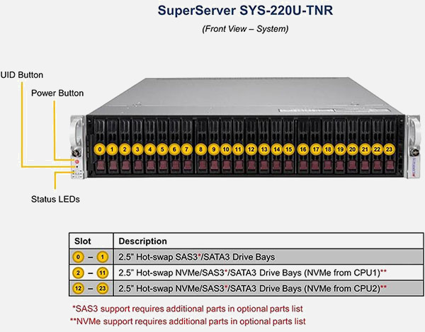 The Supermicro Ultra SuperServer SYS-220U-TNR | SYS-220U-TNR can be configured with 2.5" drives, a more space efficient and low noise option. These drives also offer energy savings and increased flexibility.