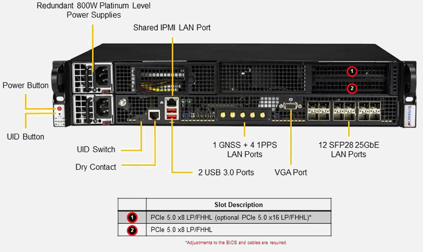 Single 4th Gen Intel Xeon Scalable processor. Up to 2x PCI-E 5.0 x8 FHHL slots. Redundant 800W DC Power Supply, 2x 2.5" SATA drive bays.