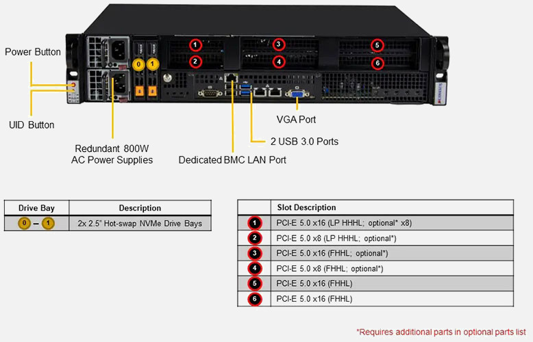 Ideal for AI, Machine Learning, Cloud Computing, Edge and Network Function Virtualisation. Up to 2x PCI-E 5.0 x16 FHHL slots, 2x PCI-E 5.0 x8 HHHL slots. Redundant 800W Power Supply, 2x 2.5" hot-swap NVMe drive bays